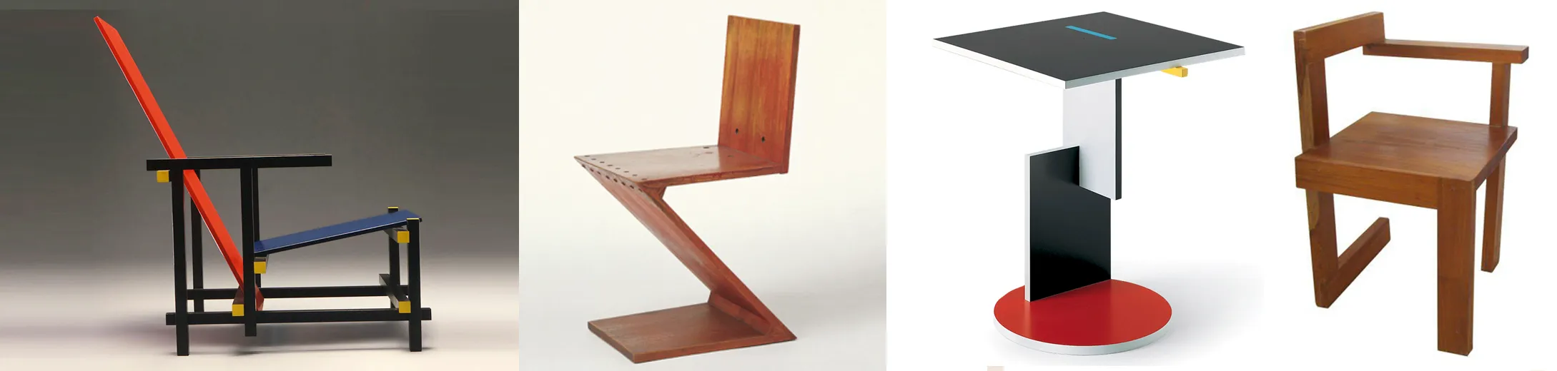 가구 디자이너로서 1917 제작한 레드블루 의자와 건축가로서 처음으로 만든 슈뢰더 저택은 몬드리안 추상화의 입체 판이라고 할 만큼 데스틸의 이념을 잘 표현하고 있습니다.