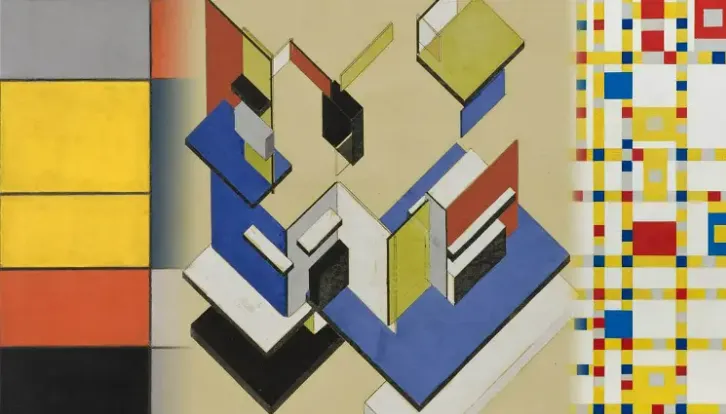 풍경화를 수직선과 수평선의 조합에 맞추어 단순화시키고 그림들을 가로와 세로의 검은선의 격자와 삼원색을 사용하는 이 조합이 몬드리안 특유의 용법이 되었습니다.