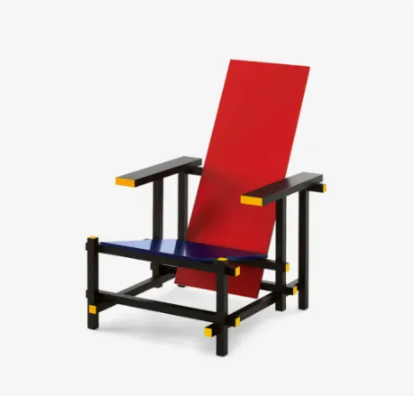 이 의자는 평평한 판재를 절단하여 단순하게 접합한 구조에 빨강과 파랑의 원색을 사용하여 기계의 미학과 대담한 색채 대비로 아름다움을 추구한 획기적인 의자였습니다.