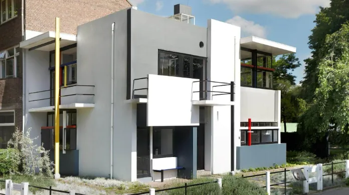 '데 스틸' 양식으로 세워진 가장 유명한 건물은 건축가 리트벨트(1888~1964)가 1924년 네덜란드의 우트레흐트에 수뢰더 부인의 의뢰로 설계한 슈뢰더 하우스입니다. 카드처럼 평평한 지붕과 벽으로 구성된 이 밝은 주택은 주위의 어두운 분위기와 극적으로 차별되고 있습니다.
