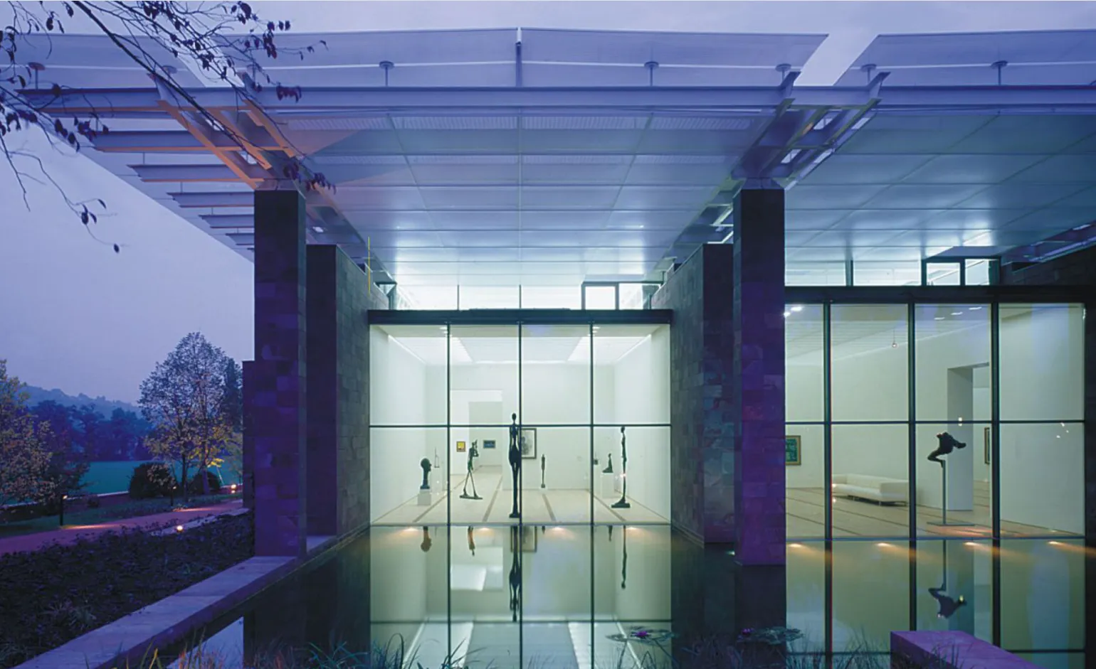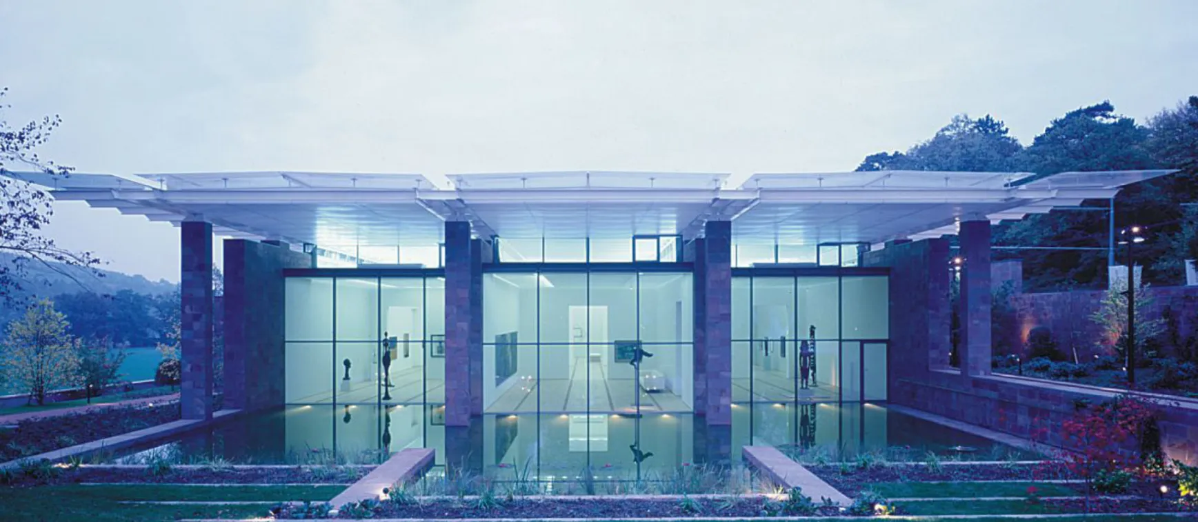 센터에는 유리 지붕이 있는 우아한 파빌리온이 있어 자연광이 갤러리로 들어오며, 주변 조각 정원은 세심하게 조경되어 야외 설치물을 위한 고요한 환경을 제공합니다.
