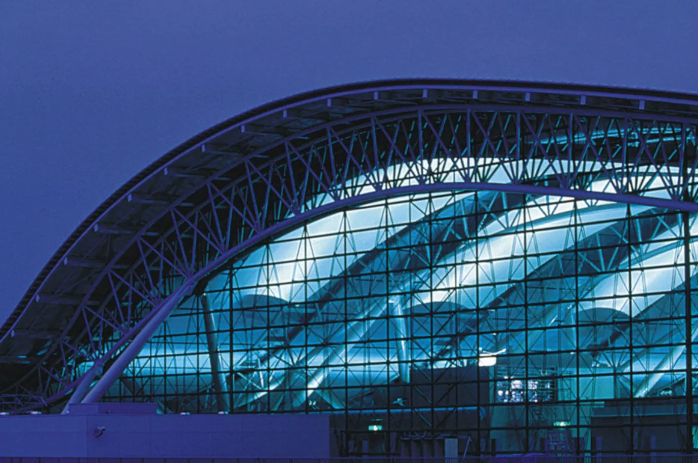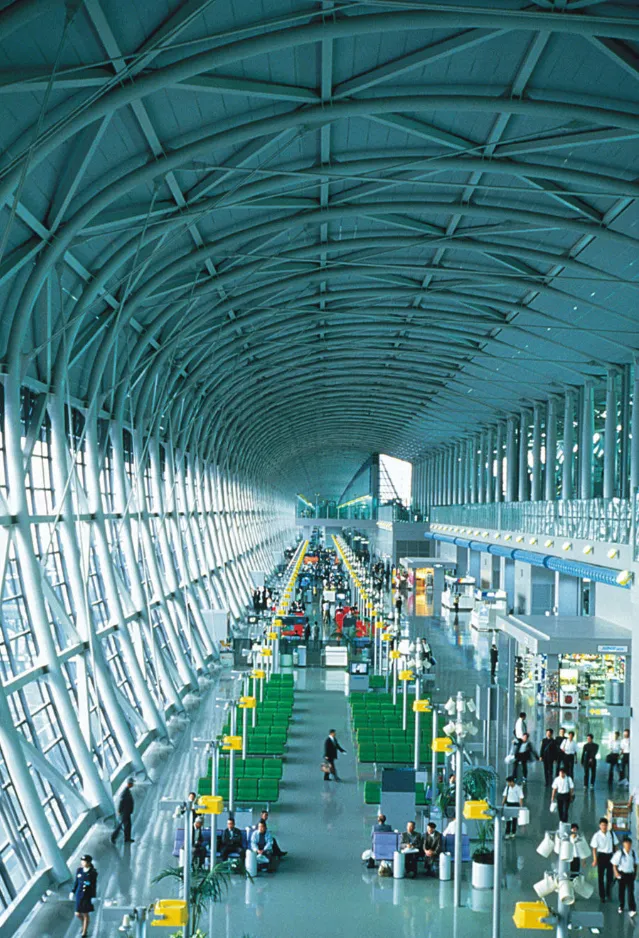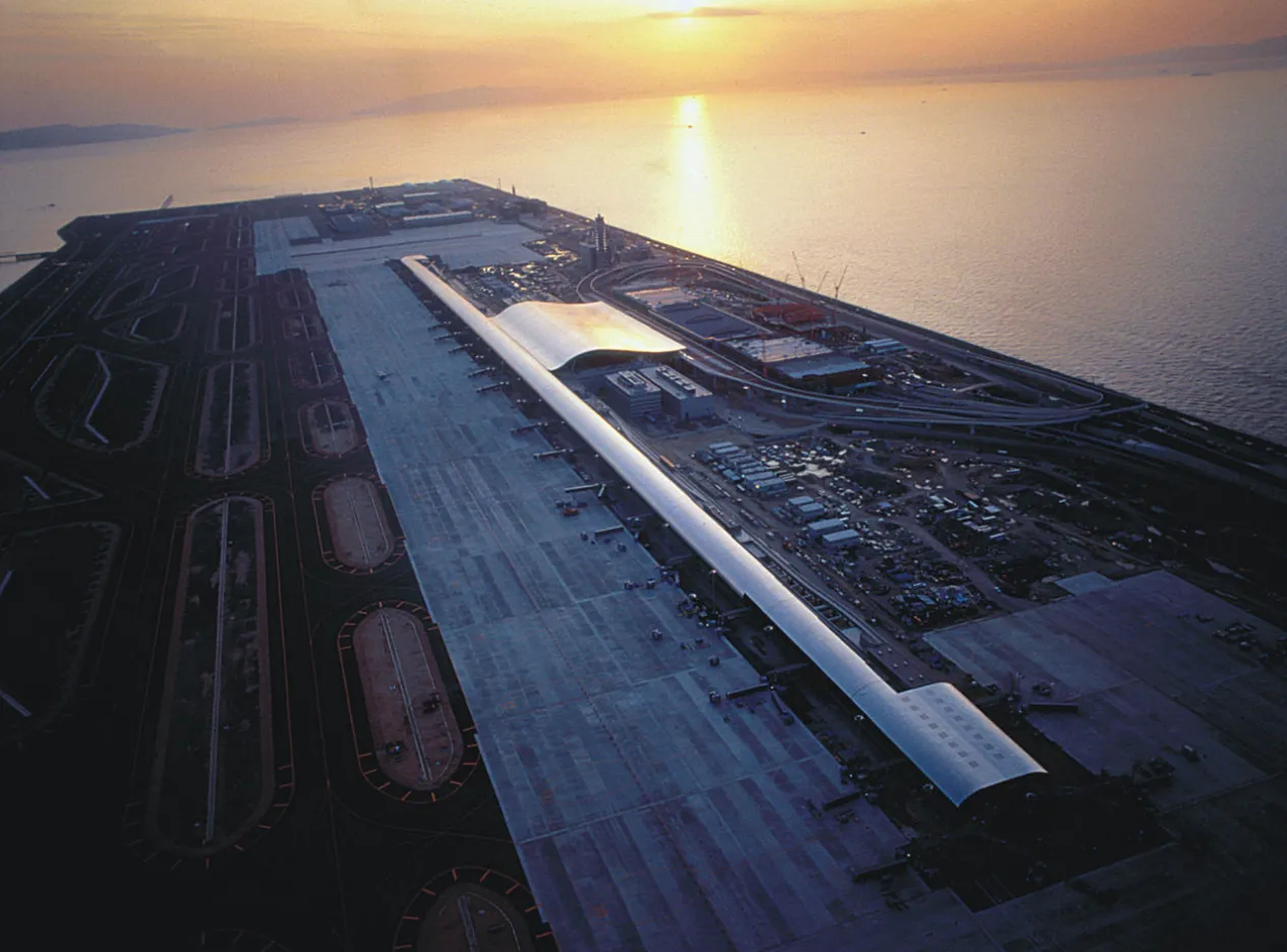 오사카만의 인공 섬에 지어진 이 공항은 지진이나 태풍과 같은 자연재해에도 견딜 수 있도록 첨단 내진 기술로 설계되었습니다. 그의 디자인은 바다에서 영감을 얻어서 매끄러운 파도 모양의 터미널 지붕이 특징이며, 개방적이고 통풍이 잘되는 공간을 만들었습니다.
