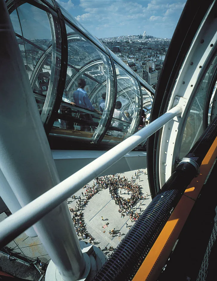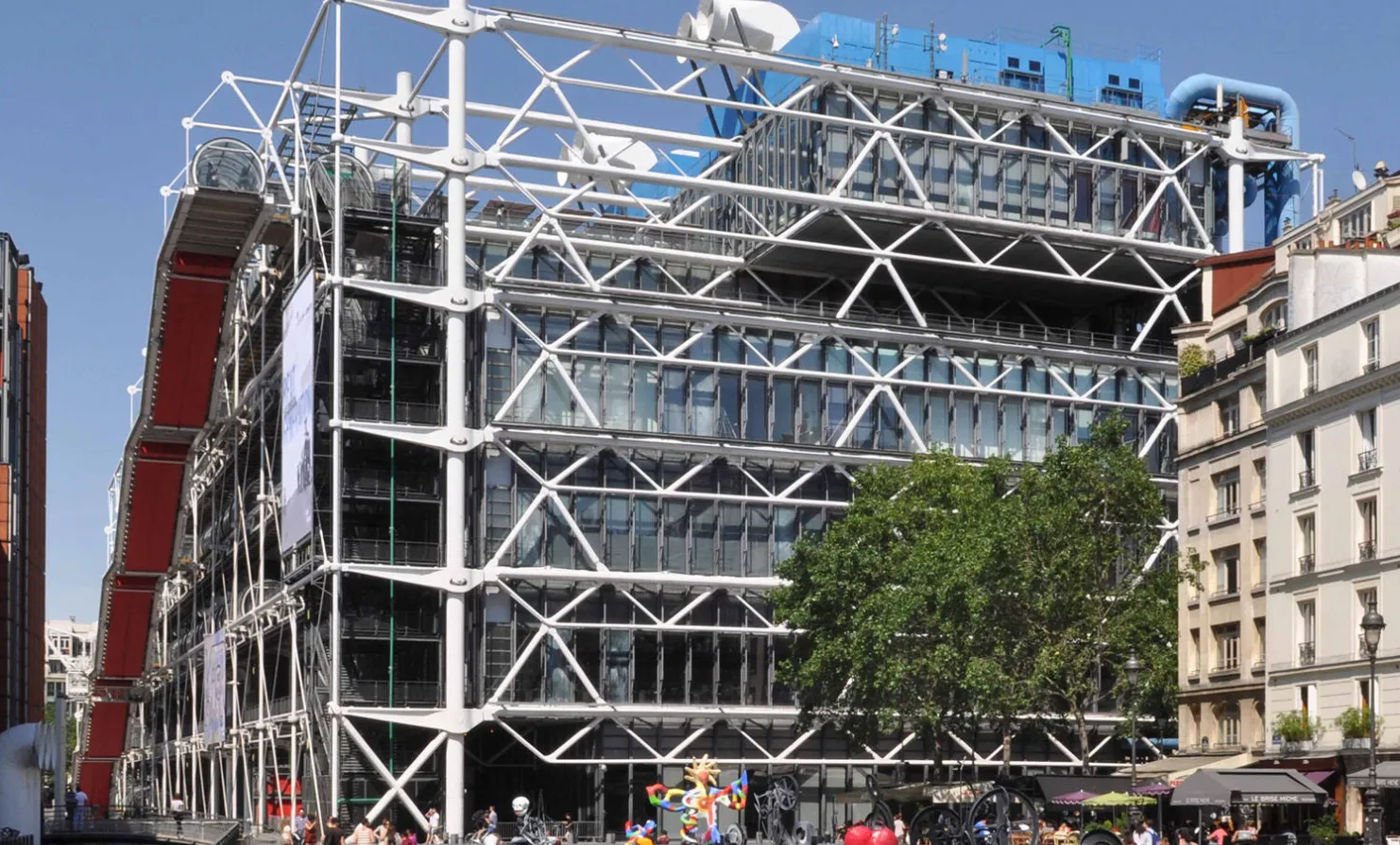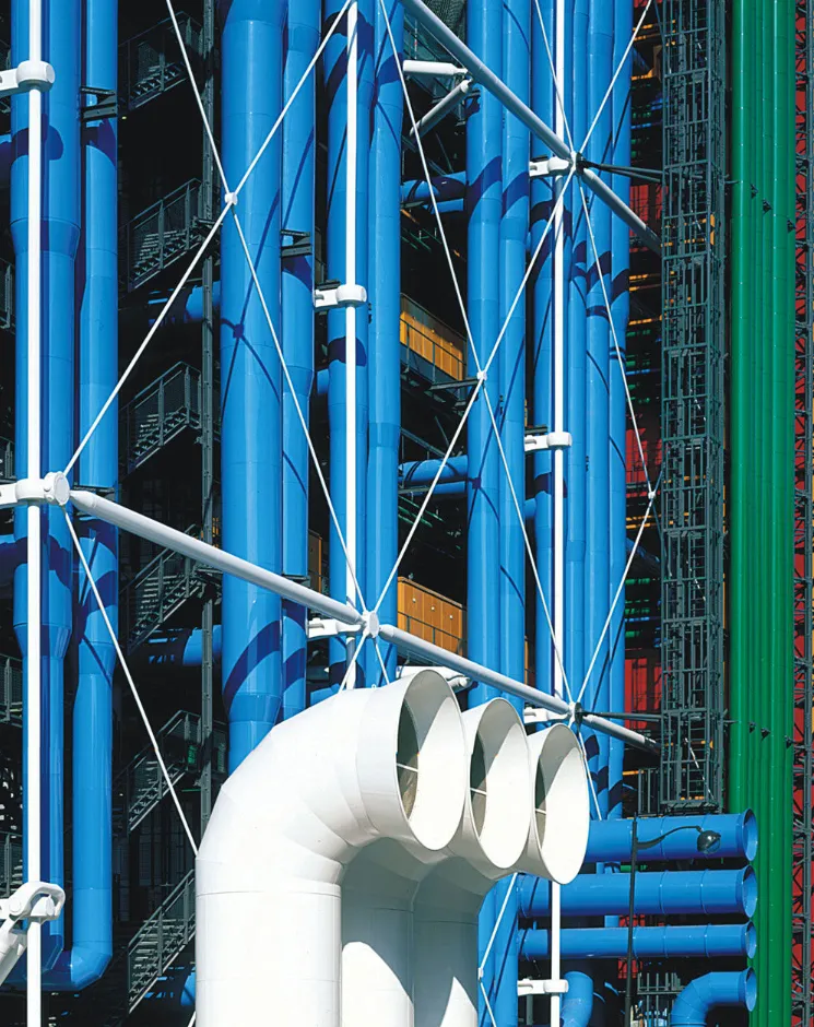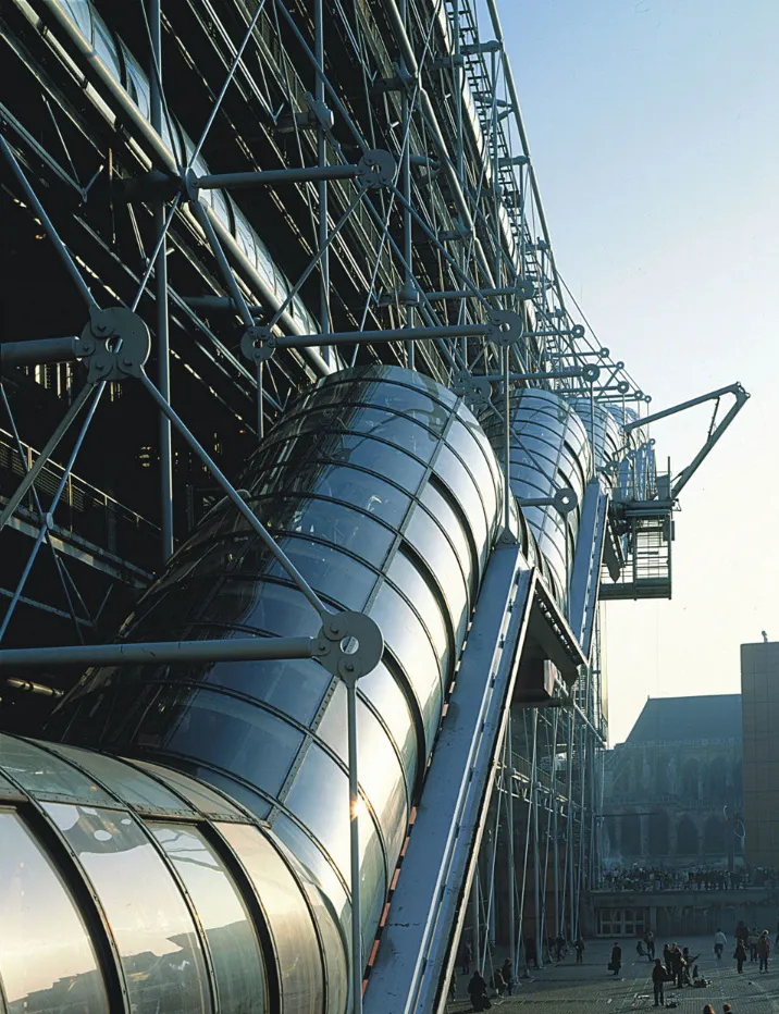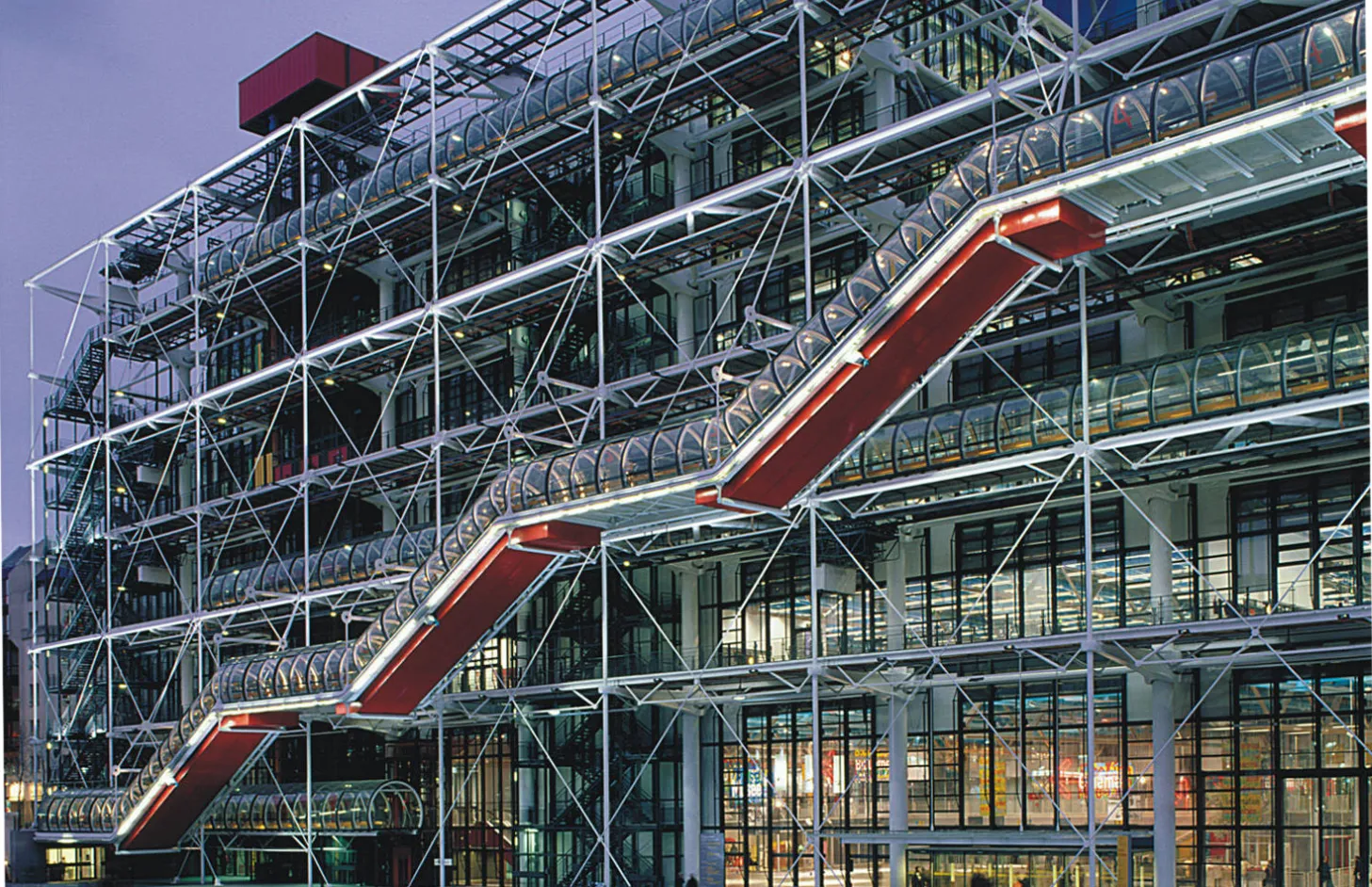 철골구조 프레임, 알록달록한 덕트, 거대한 에스컬레이터 등 보통은 숨겨지거나 이동 시설로만 쓰이던 것들을 디자인 장식요소로 활용하여 외관에 파격적으로 노출하는 인사이드 아웃의 미학을 보여주었습니다.