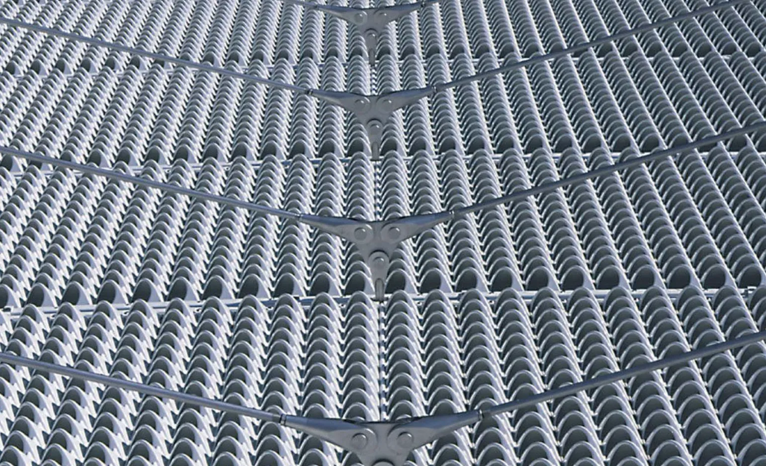 건물 외관은 세라믹 막대로 이루어진 스크린으로 그늘을 만들어 눈부심을 줄이고 탁 트인 전망을 제공합니다. 유리와 강철을 사용하여 가볍고 통풍이 잘되는 느낌을 주며, 투명성과 자연광에 대한 피아노의 헌신을 반영합니다.